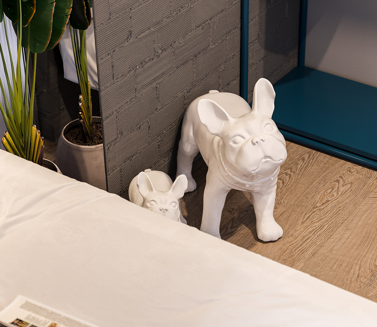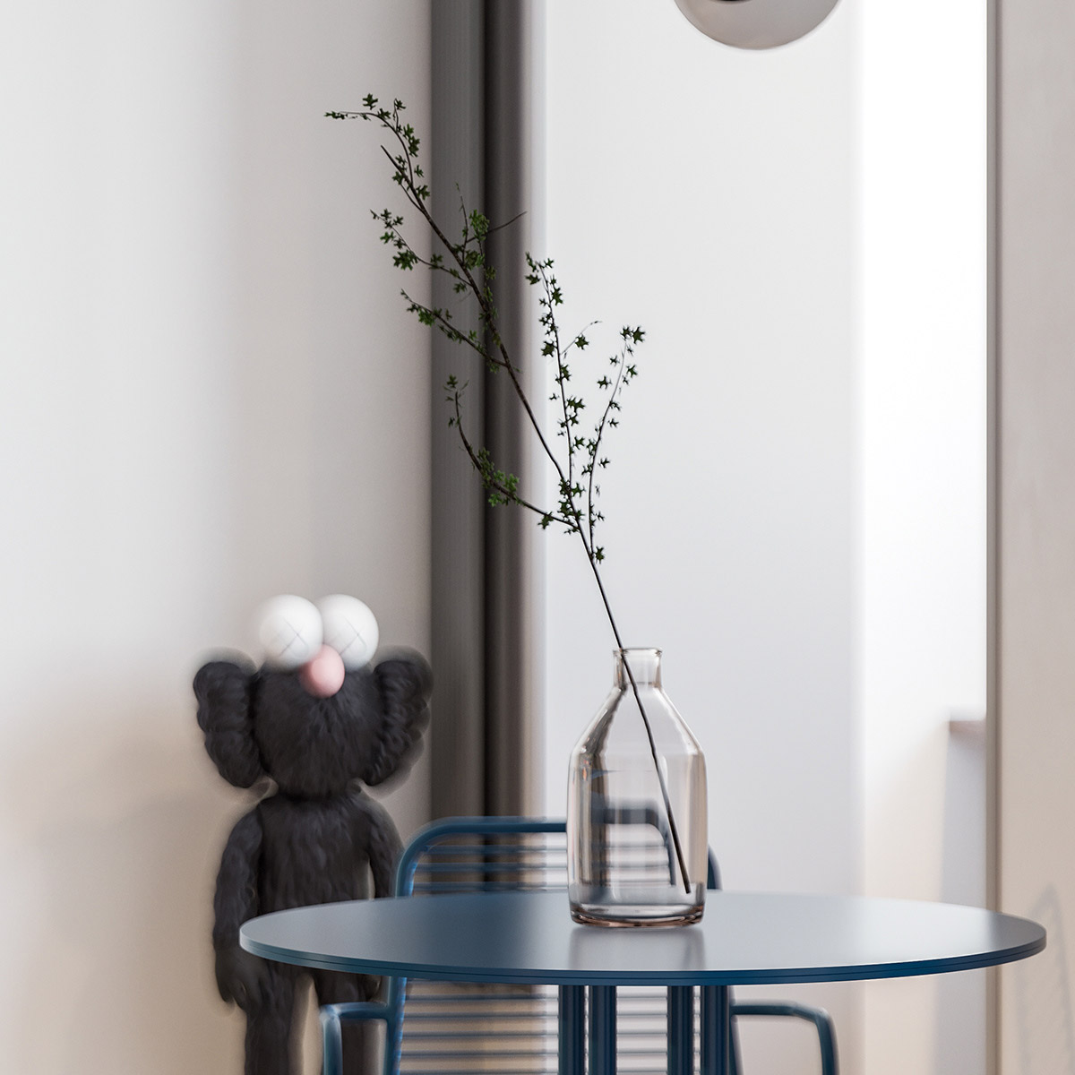 Войдя в гостиную-столовую дома номер один, мы сталкиваемся с ярко-синим обеденным сервизом. Это ключевой элемент для комнаты открытой планировки из-за преобладающего цвета и преимущественно белого декора, который его окружает.