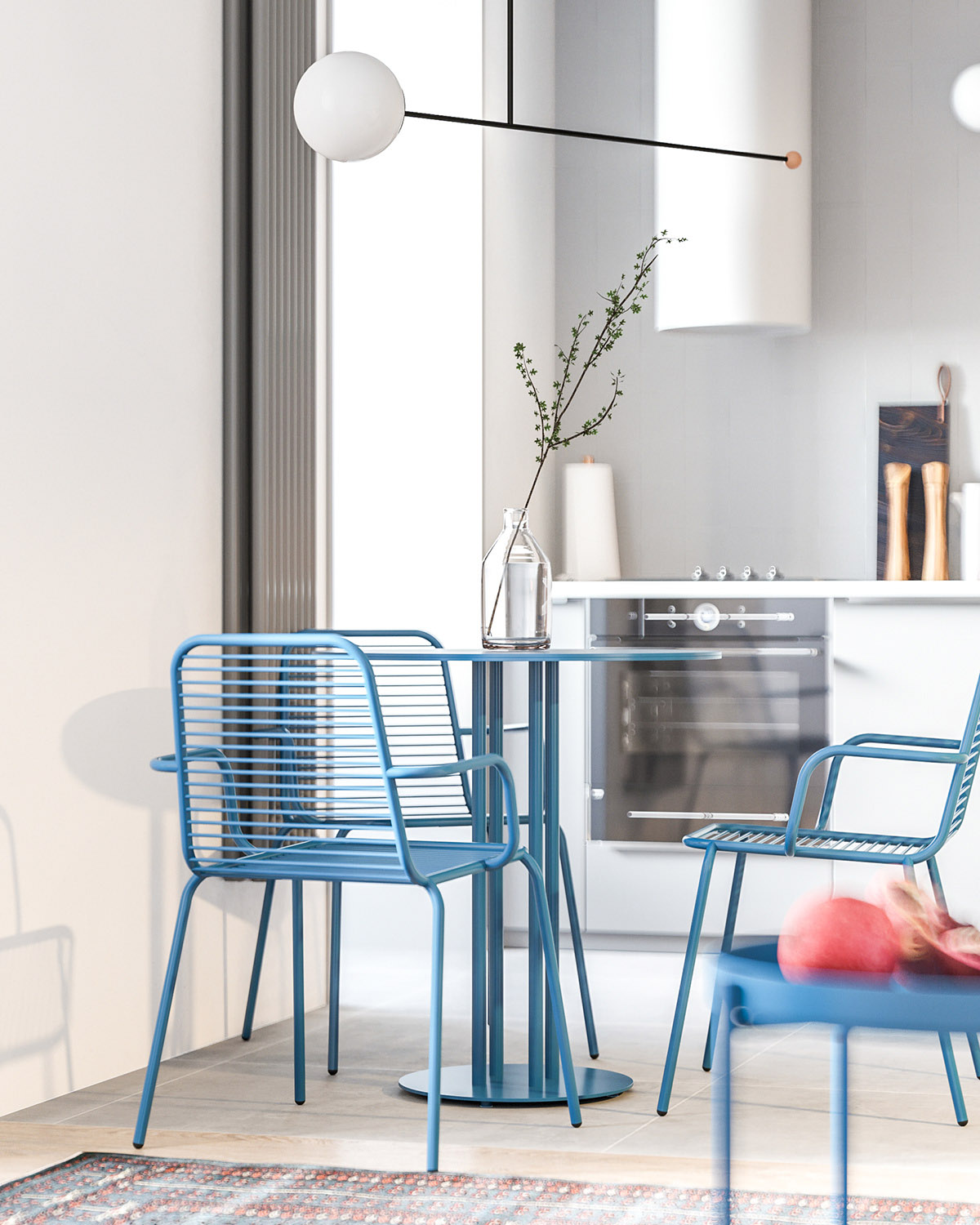Синие стулья и соответствующий им круглый обеденный стол выделяются на фоне белых кухонных шкафов и серых стен.