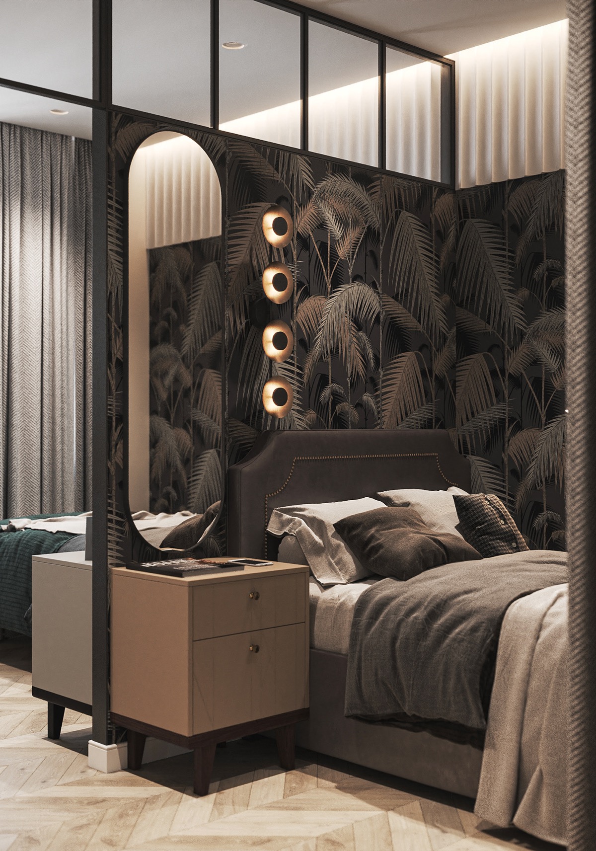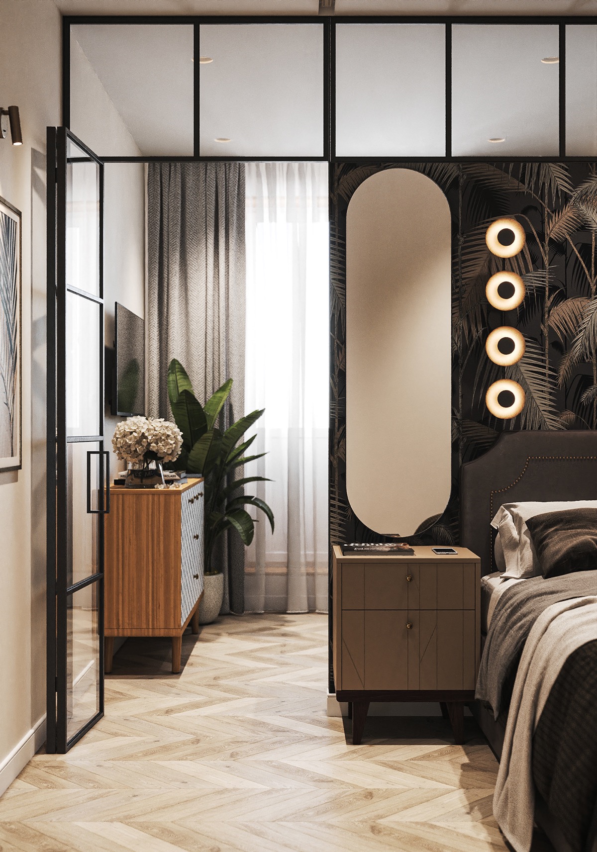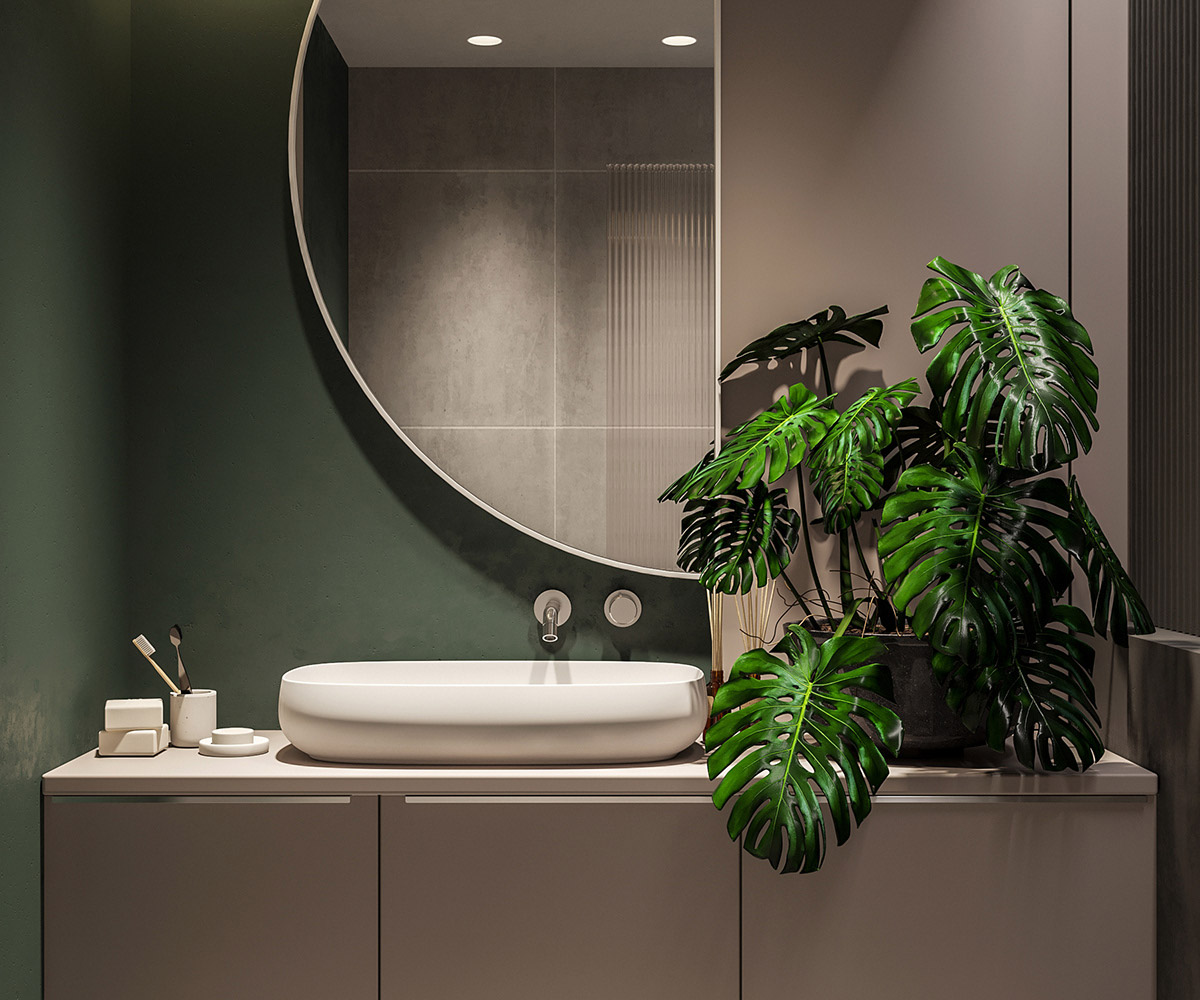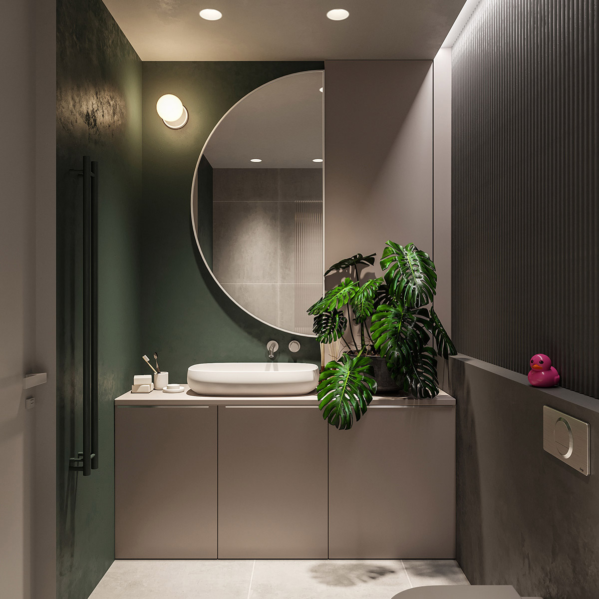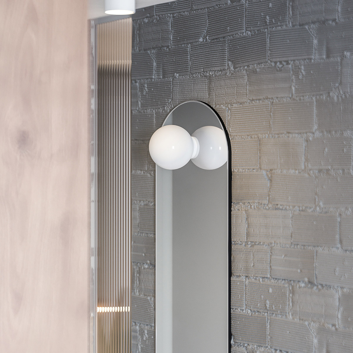 Светильник для туалетного столика соответствует другим настенным бра в форме шара, которые можно увидеть в дизайне кухни, прихожей и спальни. Зеленая краска для стен вокруг туалетного столика кажется вдохновленной природной красотой листьев монстеры деликатесной.
