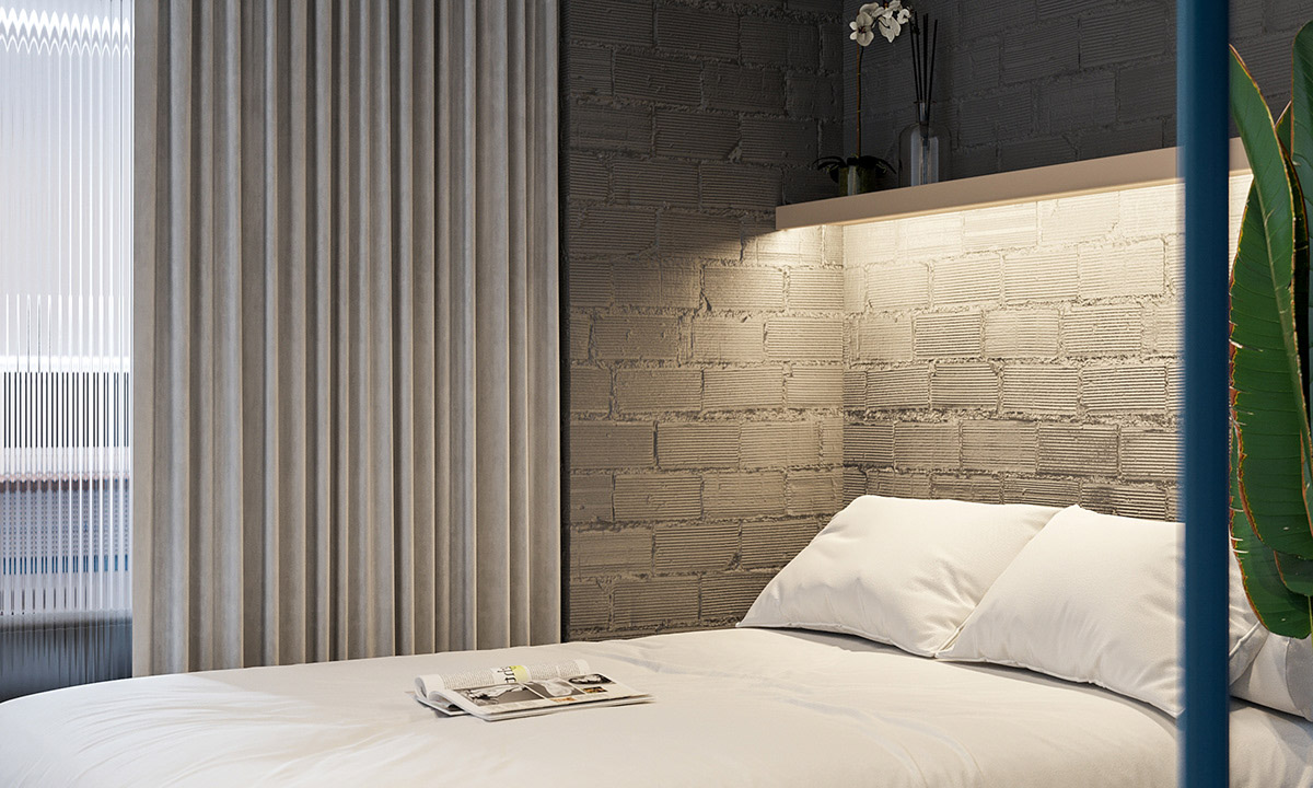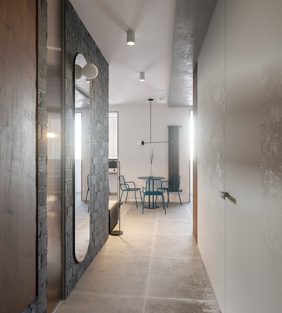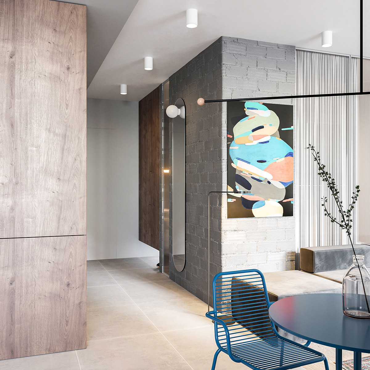 Открытая кирпичная кладка продолжается по коридору, добавляя текстуру и архитектурный характер.