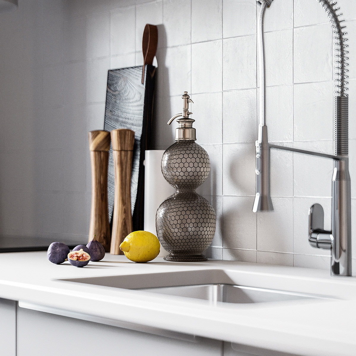 В отличие от упрощенного дизайна кухни, уникальный дозатор мыла придает столешнице интересную форму и отделку.