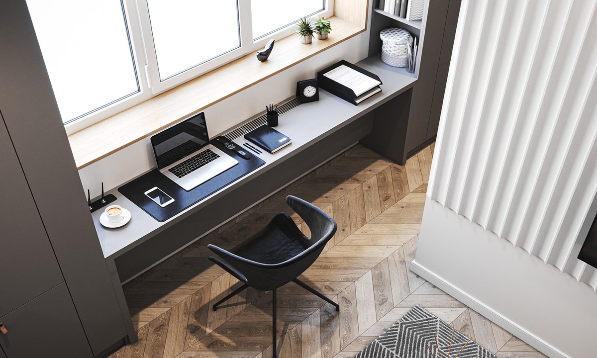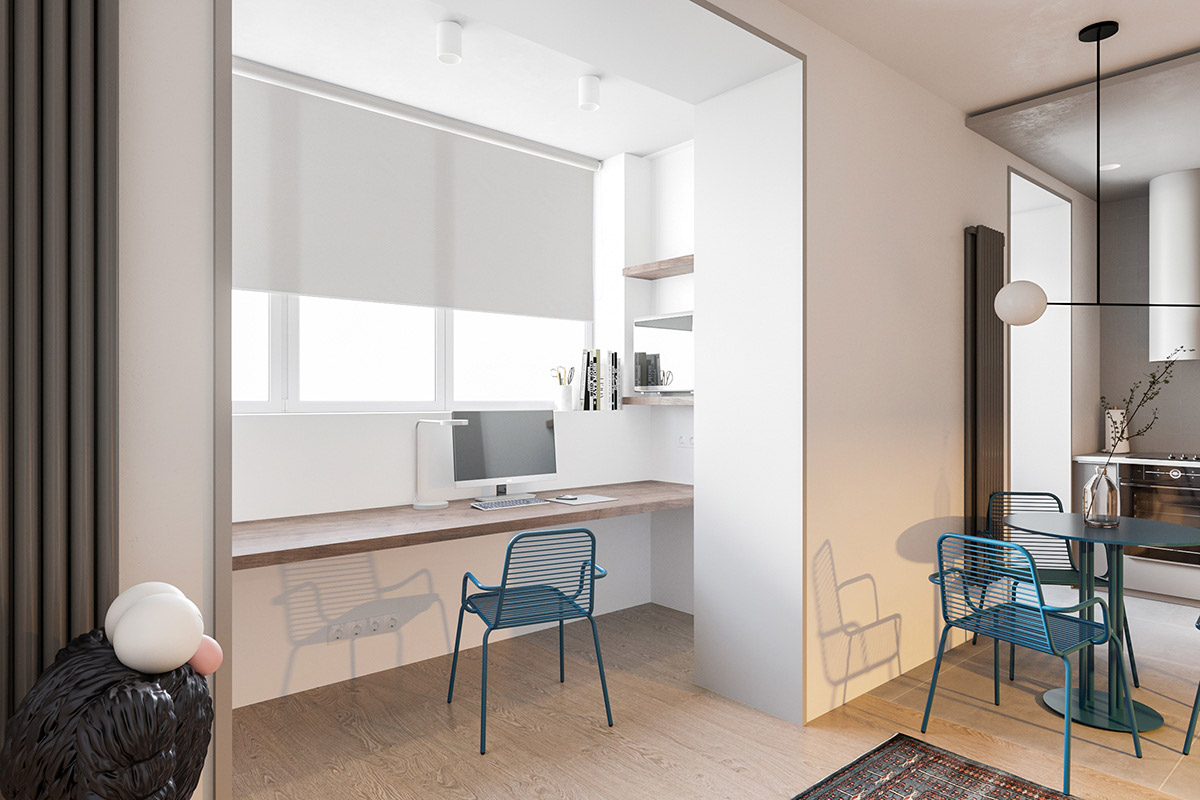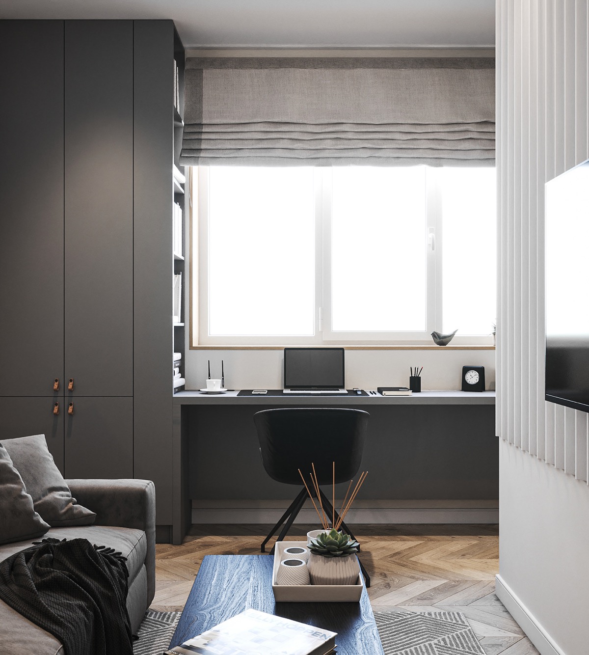 Одно синее кресло подъезжает к минималистскому домашнему офису у окон гостиной. Рабочий стол нестандартной формы занимает всю ширину оконного уголка, а сделанные на заказ офисные полки поднимаются в нишу.
