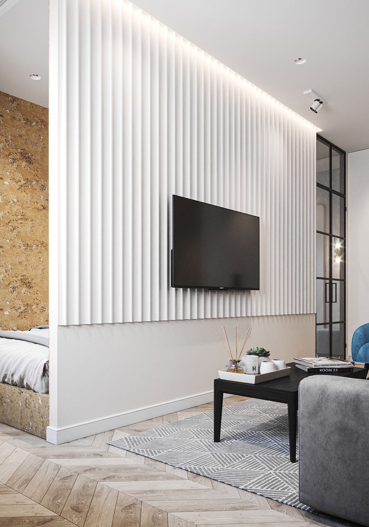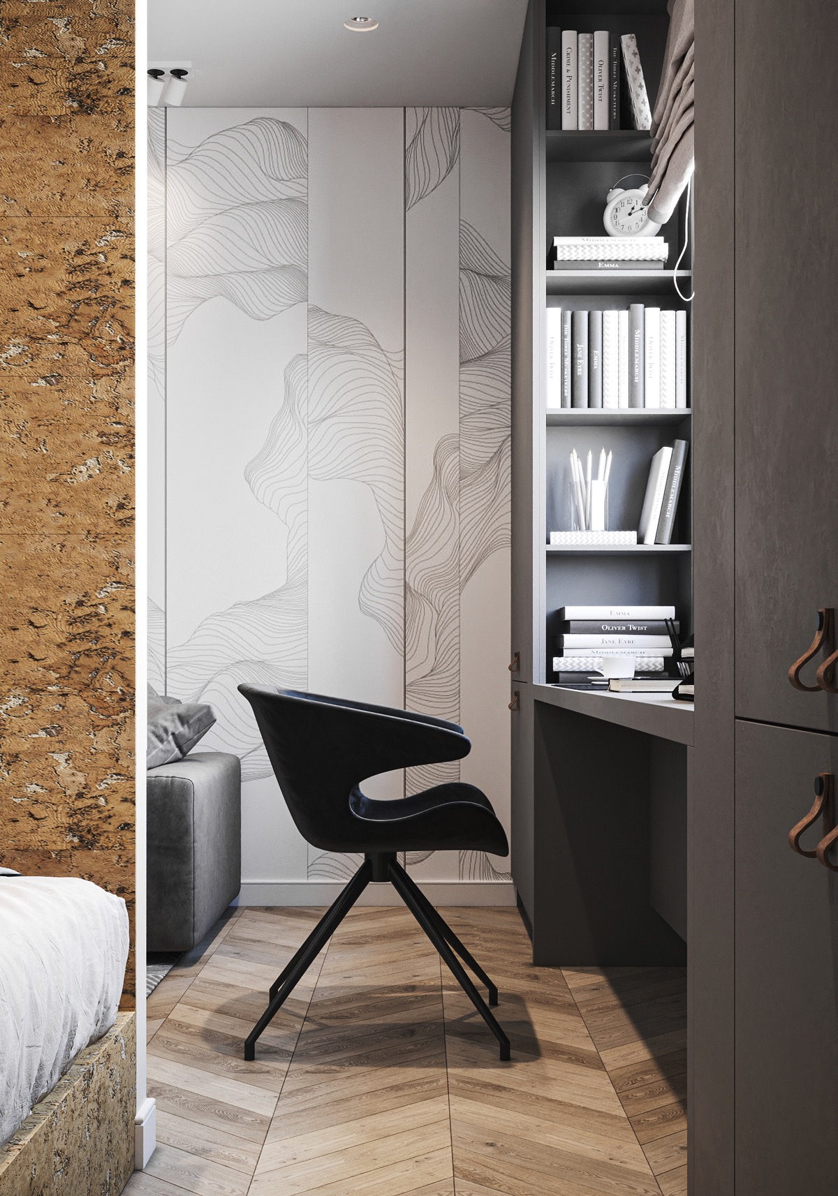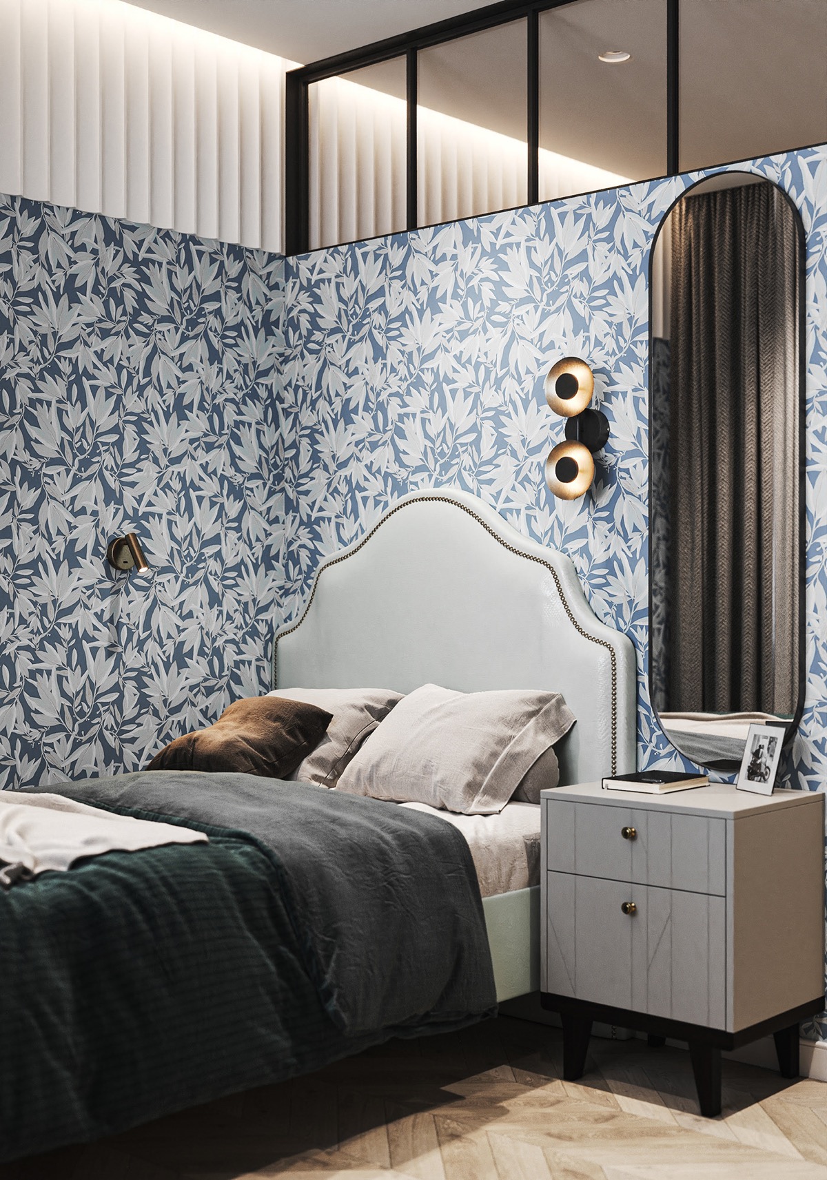 Вторая квартира с синими акцентами представляет собой планировку площадью 52 квадратных метра с тремя спальнями. Плюшевое синее бархатистое кресло сразу же освещает гостиную, рядом с серым современным диваном и стильным черным торшером.