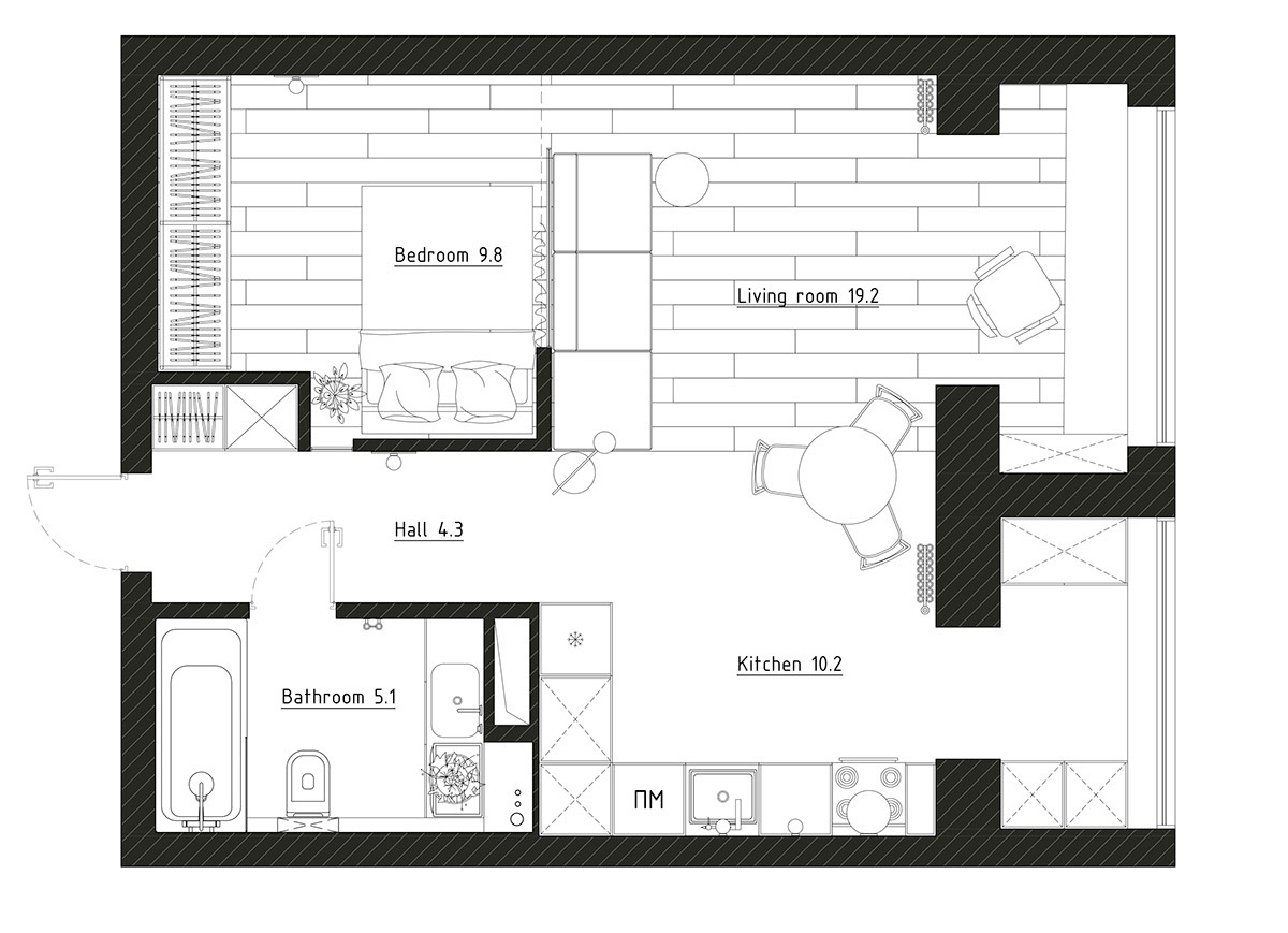 Планировка дома площадью 50,8 квадратных метров требует тщательного выбора мебели, чтобы максимизировать ощущение пространства. В современном дизайне дивана отсутствуют подлокотники, чтобы уменьшить занимаемую площадь. Небольшой приставной столик компенсирует недостаточную площадь поверхности цветом.
